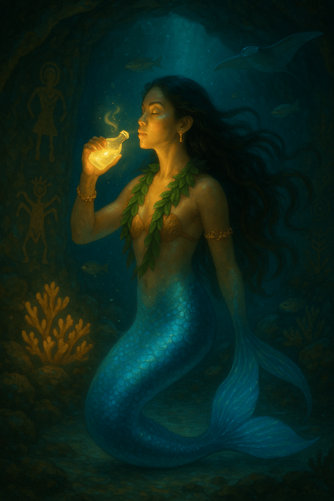 A month before her departure, Sirena fell in love with Nakoa, a brave and loyal guardian of the royal court. Their bond grew stronger each day, and parting from him would be her hardest trial. On the eve of her departure, Kiloʻula summoned the sacred mana from the heart of Kaiʻola and crafted a potion. Sirena drank it and entered the mouth of the koholā whale. As they ascended toward the human world, Sirena transformed into a human.